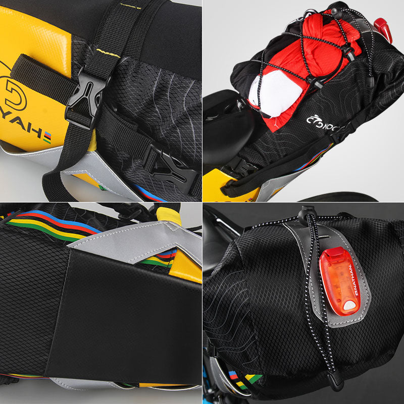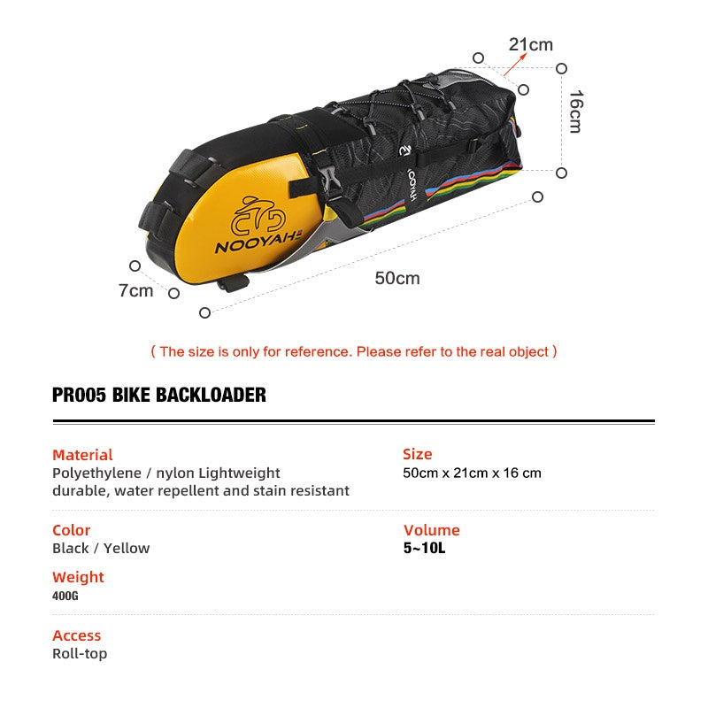 NOOYAH PR005 BIKE BACKLOADER is designed for bikepacking adventure. A lightweight and practical alternative to panniers, the seatpack has 4 attachment points for improved stability as well as snap clip strapping for easy detachment.
